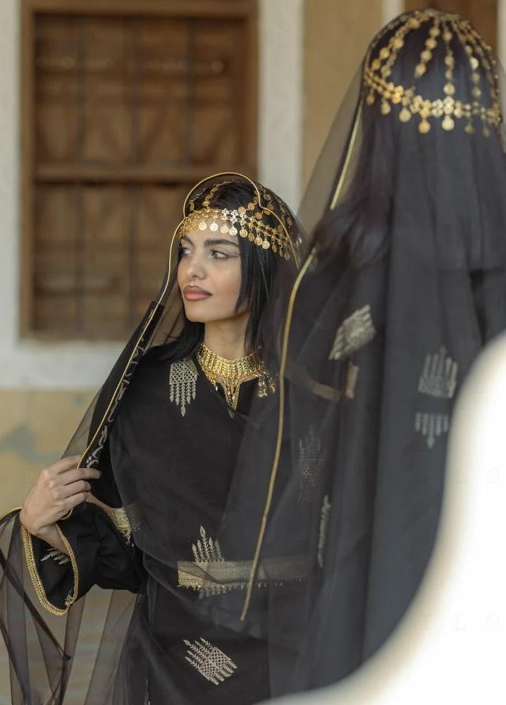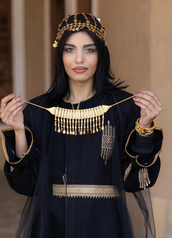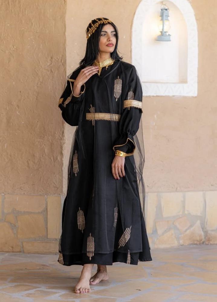 جلابية سوداء مصنوعة من قماش عالي الجودة مزينة بتطريزات ذهبية مستوحاة من التراث السعودي الأصيل.